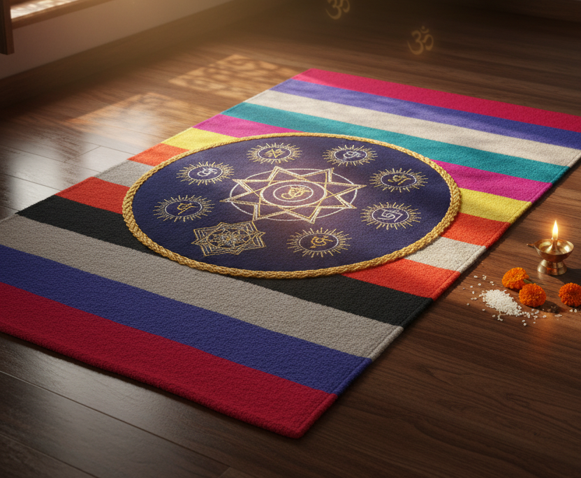 The Navagraha SukhÄsana is not just a worship seat it is a spiritual tool designed to enhance your practice. Crafted from premium wool and infused with the sacred colors of the nine planets, this Äsana supports peace, concentration, and energetic balance during puja, meditation, mantras, and yogic rituals.